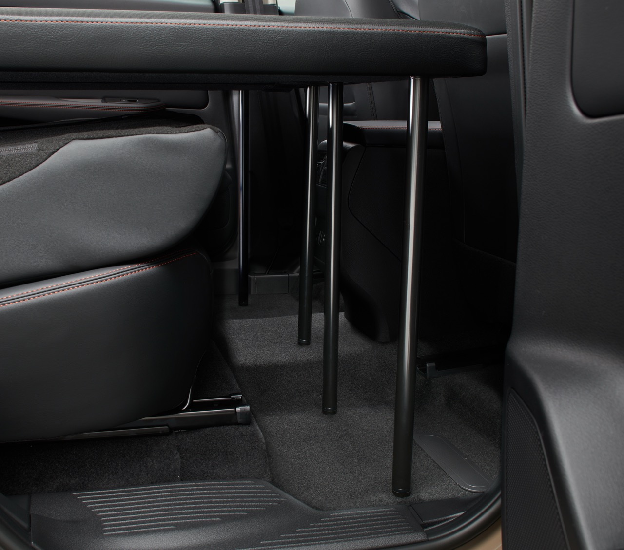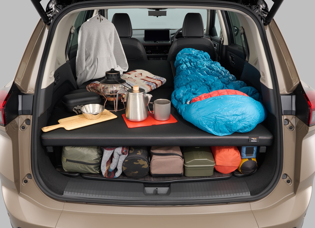 研发团队在保留第二排座椅功能的同时,加入了一套可摺叠式的“Multi-Bed”多功能床垫系统。这套系统从第二排座椅后方延伸至整个车尾空间,形成一个平坦且宽敞的休息区域。床垫选用了顶级的 CORDURA 品牌高强度织物,这种材质具备极佳的耐磨性、抗撕裂性与防水拨水功能,即便带着沾满泥土的户外装备上车也无需担心损坏。细节方面,床垫特别加入了与车座一致的 Lava Red 熔岩红缝线点缀,营造出一致的专业户外质感。更聪明的是,床垫下方保留了充裕的储物空间,让你在睡眠时依然能妥善安置行李,实现了舒适度与功能性的完美平衡。