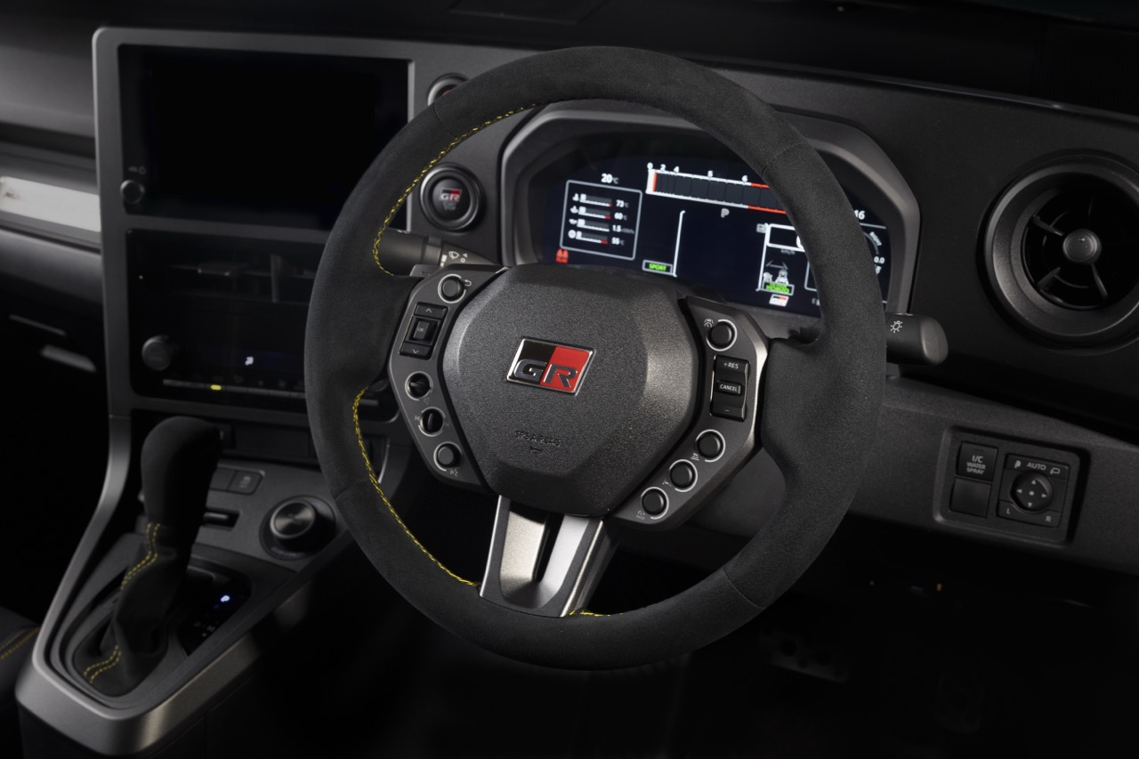 全车座椅及方向盘大量使用了高级麂皮材质,并配上 Morizo 专属的黄色缝线。特别值得留意的是其方向盘设计,厂方借鑒了 GR Yaris Rally2 赛车的经验,将方向盘直径缩小以提升操控灵活性,并重新设计了换挡拨片与各类功能按键,使其更符合人体工学,方便车手在激烈驾驶时进行盲操作。每部车的排挡座后方都镶嵌了带有序列号的 MORIZO RR 专属铭牌,前挡风玻璃上甚至还有 Morizo 的签名刻印,这份独特性与仪式感,绝对能满足车主对珍稀性的追求。