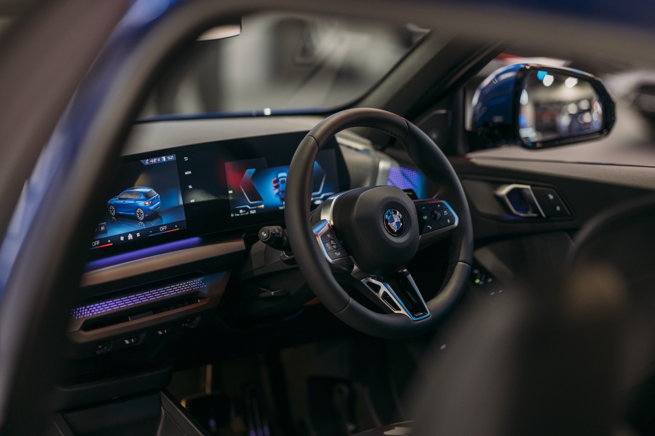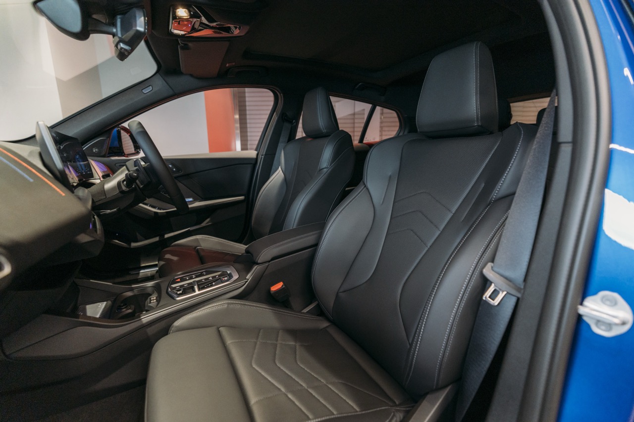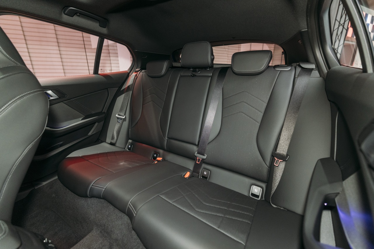 驾驶舱採用以驾驶者为中心的布局,最吸引眼球的莫过于由 10.25 吋电子仪錶板与 10.7 吋轻触萤幕组成的一体式曲面萤幕,并搭载了最新的 BMW Operating System 9,让多媒体与空调操作全面数码化 。内饰选材亦与时并进,使用了具穿孔设计的 Veganza 纯素皮革,触感仿如真皮却更符合环保趋势,并提供摩卡色或象牙白等多种配色选择 。此外,车内空间表现亦具备极高灵活度,后排座椅折叠后可将尾箱容量由 380 L 扩展至 1,200 L,配合全景式玻璃天窗与 Harman Kardon 音响系统,让这台掀背车在日常实用性与感官享受之间取得了绝佳平衡 。