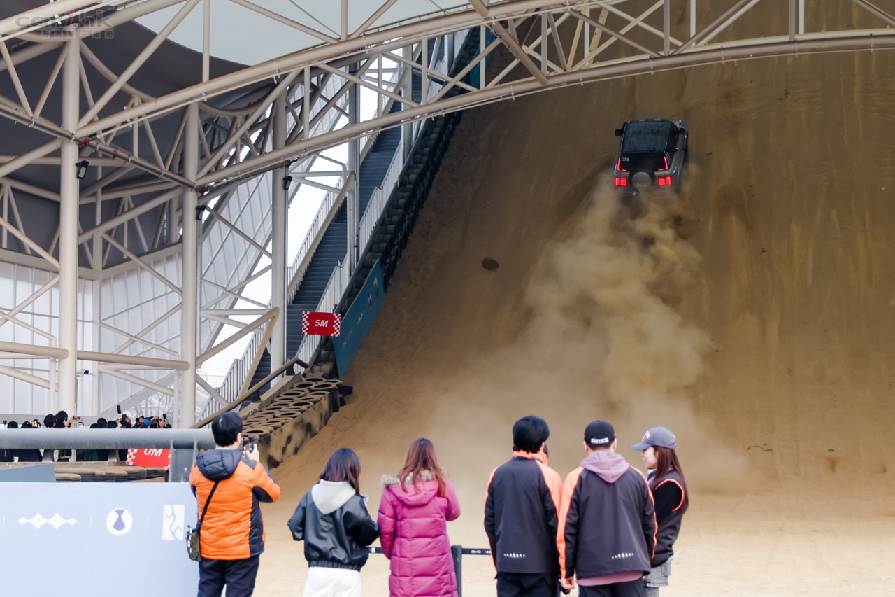 其中,最引人注目的莫过于获得健力士纪录认证的悬天沙坡区,其垂直高度达29.6米,冲坡坡度达28度,由6,200吨特製沙子建造,完美模拟了蒙古阿拉善沙漠的真实质感。这种场地设计不仅是视觉上的震撼,更是比亚迪对车辆极限驾控能力的自信展现。