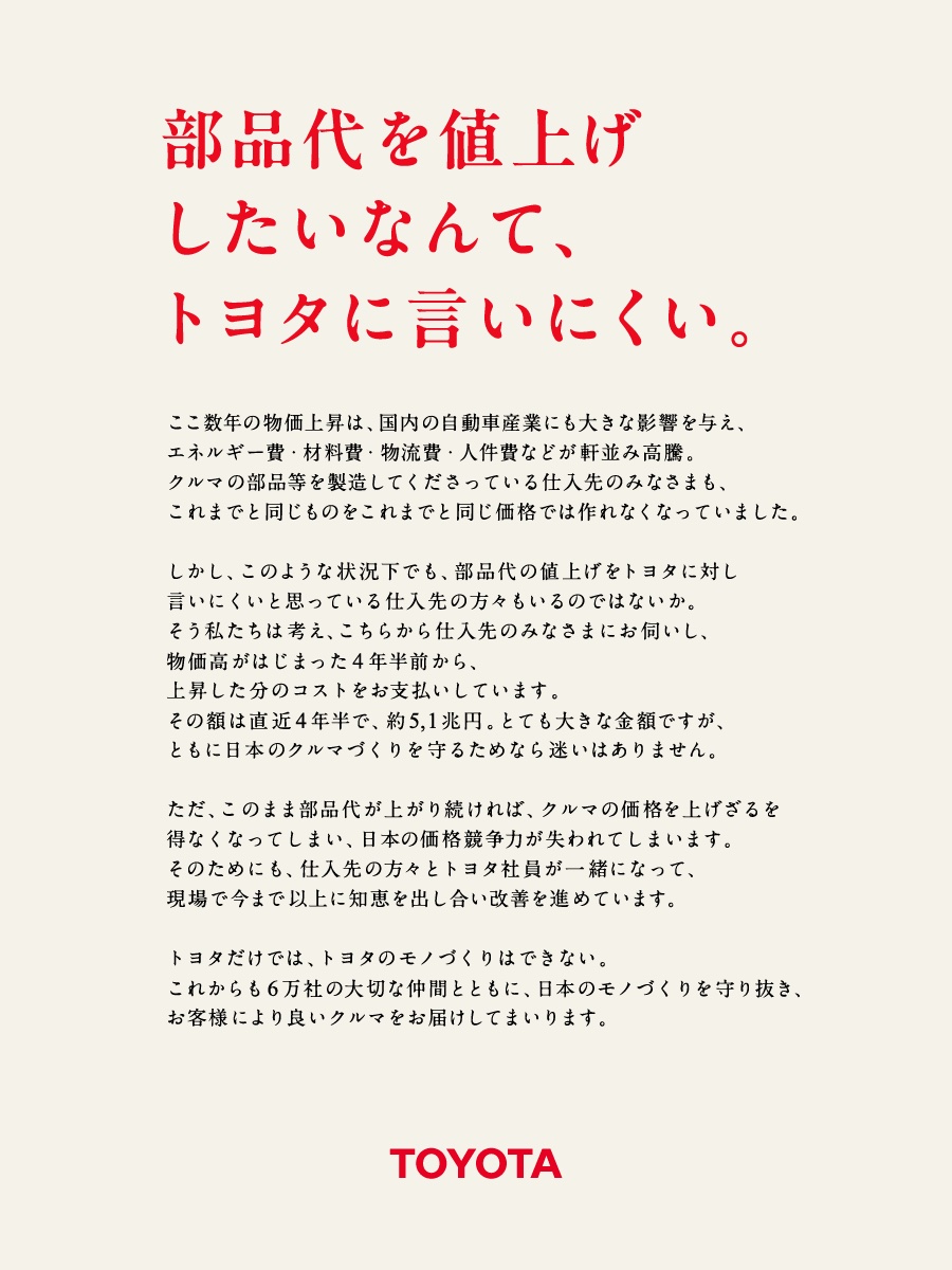 丰田汽车 Toyota 于1月23日在官方社交平台发表了一篇情感深沉且极具震撼力的文章,标题直接点出核心:“难以对丰田启齿:我们想调升零件价格。”这篇文章并非单纯的公关辞令,而是针对近期坊间对于供应链成本波动的直接回应,罕见地揭露了这间全球汽车龙头在通胀压力下,与供应商之间那种如履薄冰却又必须共存的紧密关係。