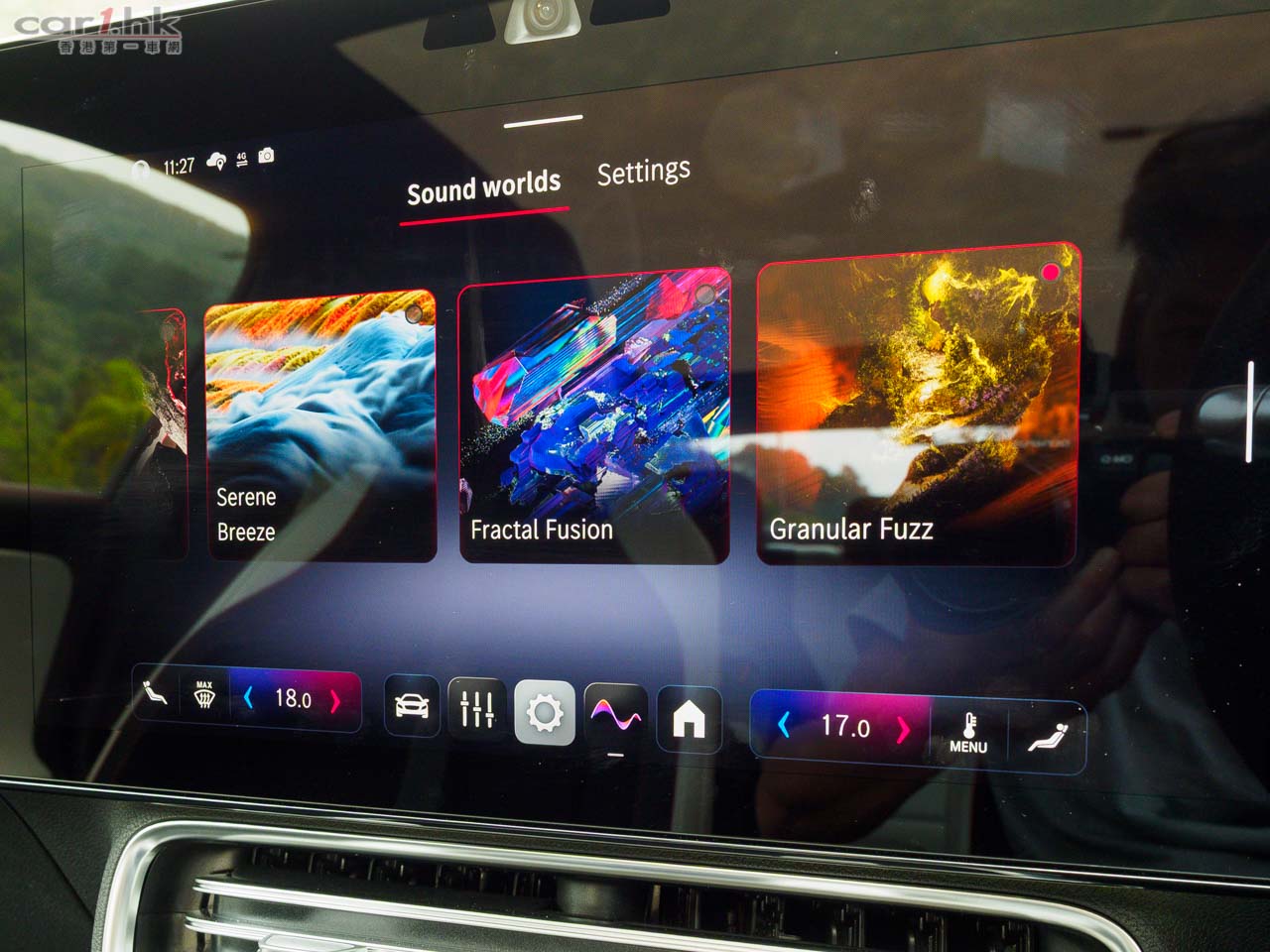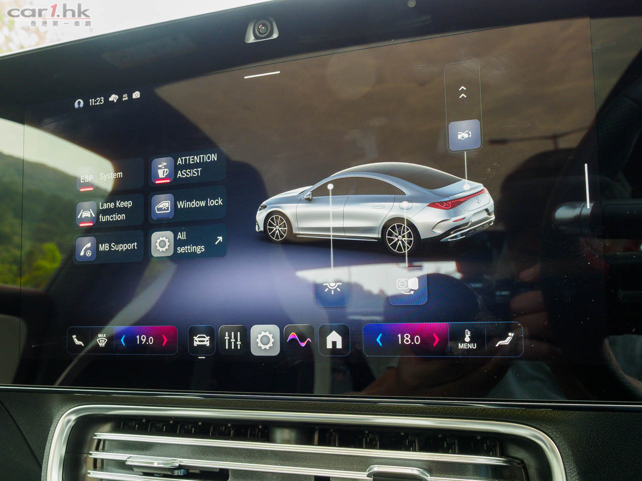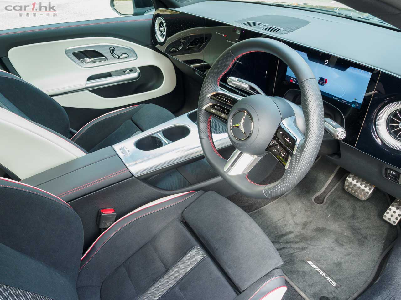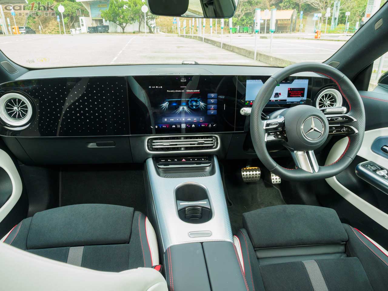 相比可以由皮革、塑胶、木块、厚垫、电镀边等不同材料砌出豪华、典雅、跑格等不同观感,即有个“台”形的錶板设计,坐在新 CLA 上,平治以科幻之名硬生生地将一幅与门板、中台和其他地方没有关係的全阔黑板挞在你面前。錶板同样可装配乘客面前的第三幅显示屏组成为 Superscreen,标準样式只有一块布满“星星”图案的饰板。屏幕随着属第四代 MBUX 系统的 MB.OS 有新的图案,仪錶不似以往的平治有 Sport、Understated 等几个主题和大地图等几个模式的图案可选,现只有像一向“Classic”的黑白色圆錶和“车仔跟线”两种,少了点花巧的看点;经适应过中屏幕新的介面和图案后,内里的功能其实与以往大同小异,可找到 64 色和 10 个主题的气氛灯;按 Mon 时“叮叮噹噹”的 Sound Experience 除有如常的 Silver Waves 和 Vivid Flux、AMG Line 特有的 Roaring Pulse 和 Serene Breeze 外,还有新出的 Fractal Fusion 和 Granular Fuzz 共六种,各有各“叮叮噹噹”;对途人播出的音效有含蓄的 Understated 和不含蓄的 Characterful;前座有按摩功能和 Kinetic 自动抗倾侧垫;主动安全系统如常有 Active Brake Assist 前方自动煞车、Lane Keeping Assist 离线警示和扭軚辅助、Blind Spot Assist 盲点有车警示;全自动泊车系统懂同时搜寻左右两边,再列出可泊的车位给你“笃”Mon 拣,现更可打斜泊入和懂得驶出,smart #5 好像也是这个玩法;串流平台有 Disney+ 旗下的 Pixar、Marvel、Star Wars、20th Century Studios、FX、Searchlight Pictures、National Geographic、Sony 的 RIDEVU 睇,电玩有 Boosteroid;这个有短期记忆的 Virtual Assistant 会用 AI 与你在导航、发问时用广东话对话。OTA 首次连安全和辅助系统也有隔空更新。系统亦为日后的自动驾驶系统、导航加入搵充电位等功能铺路。在应该是亮点的显示屏之外,双层的中桥例牌上层有充电座和杯格,下层有胶兜;喷嘴形的左右风口有气氛灯光圈;门板的圆筒形手柄有点像 C-Class 那条,新的座椅调校制改为以圆形排列;无柱的天幕玻璃顶有隔 UV 层;首次装有的中央气袋由司机位椅背弹出。