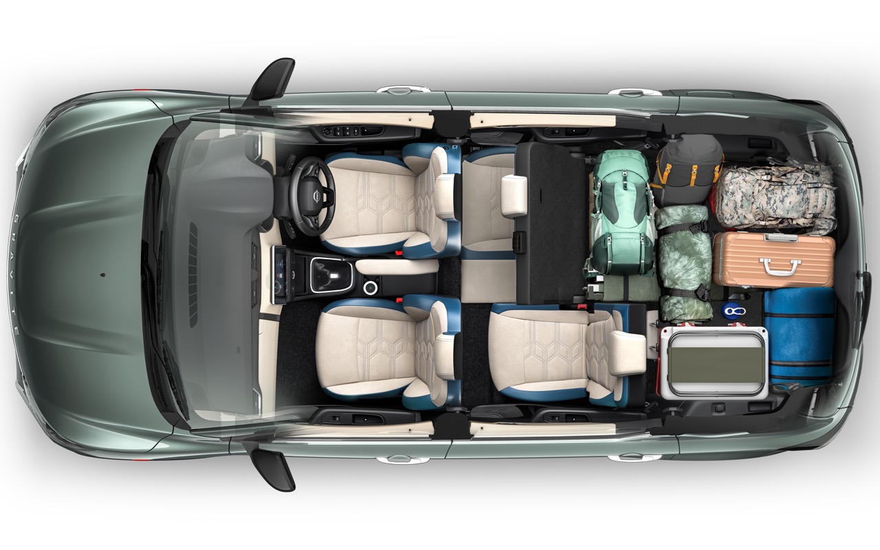 内饰空间与实用性是Gravite的核心卖点。研发团队针对日常通勤与长途旅程的需求,打造出一个具备高度模组化的宽敞座舱。车内提供2至7人的弹性座椅布局,最令人惊喜的是其第三排座椅採用可拆卸式设计,拆除后行李箱容积可扩张至高达625公升,足以应付大家庭的远行需求。针对热带气候,车内配置了强化的空调系统并设有专属出风口,确保三排乘客均能享有舒适的体感。科技配置亦紧贴潮流,配备20.3厘米的大型中控萤幕,支援无线Android Auto与Apple CarPlay,并加入自动解锁/闭锁、手机无线充电及前后泊车感应等便利功能。