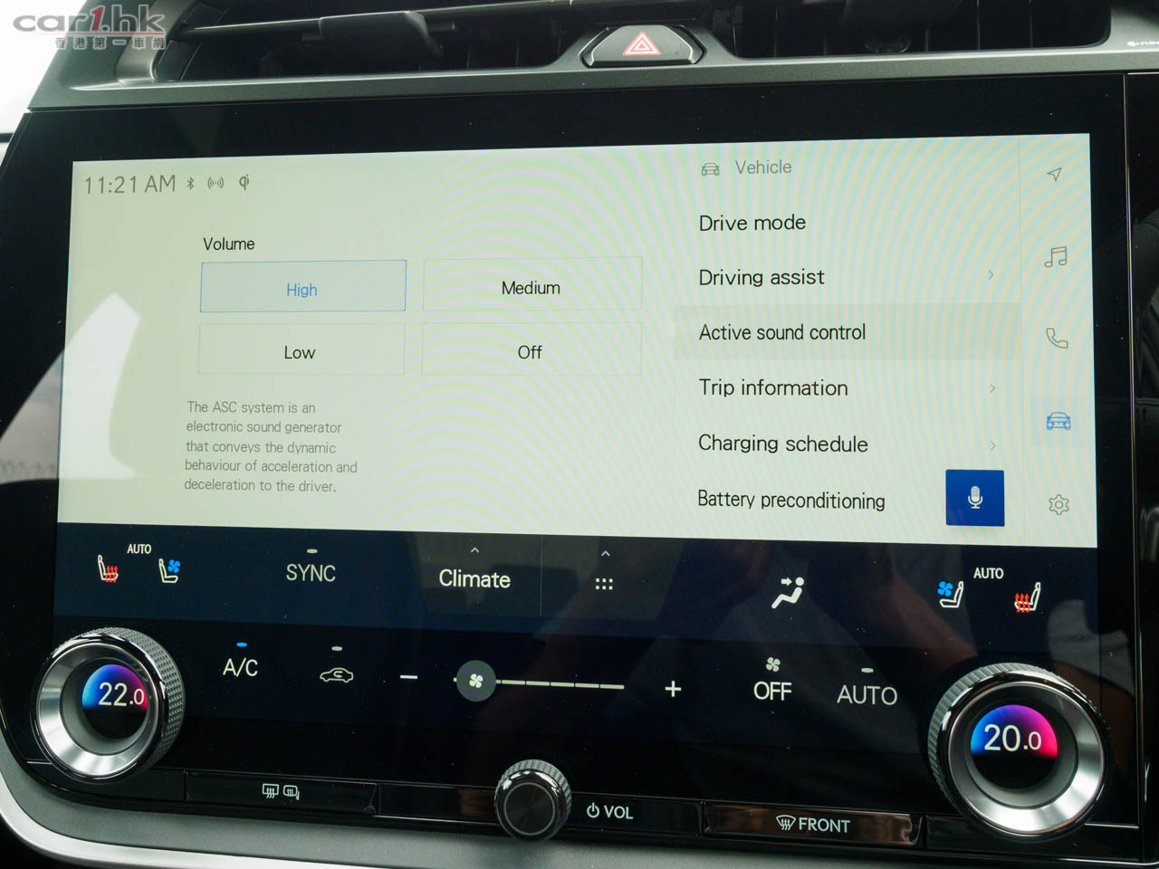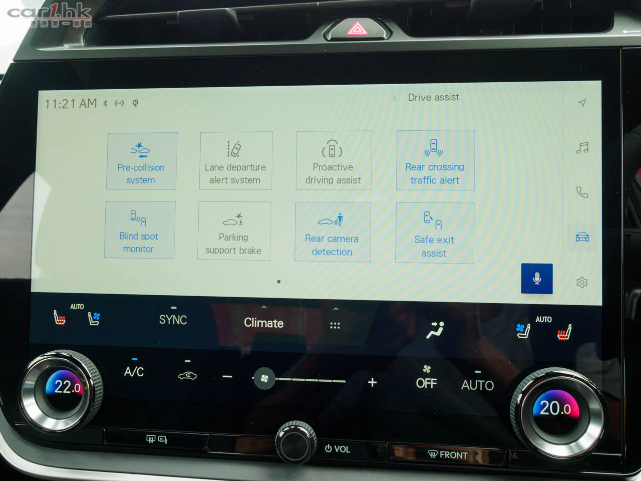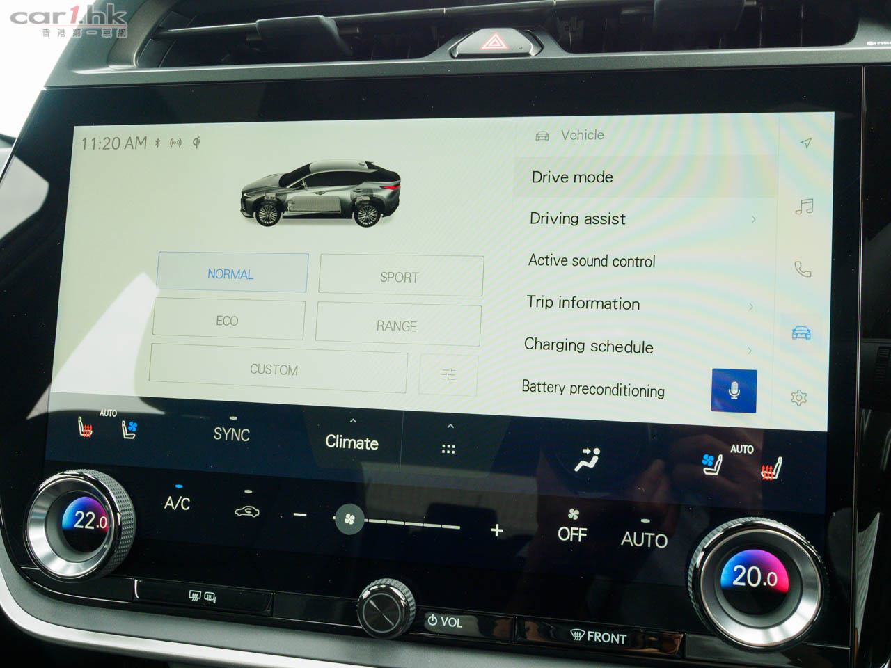 之前不见有的 Active Sound Control 会在驾驶时发出“wee…wee…呜…呜…”声。配备 Lexus Safety System+ 3.0 主动安全系统,包括懂侦测行人和单车的 Pre-Collision System 前方自动煞车、Lane Departure Alert 离线警示、Lane Tracing Assist 离线自动扭軚、Emergency Steering Assist 路旁障碍自动扭軚、Parking Support Brake 倒车障碍自动煞车、Rear Cross Traffic Alert 后方横向障碍警示、Blind Spot Monitor 盲点有车警示、开门有车警示和不准开门 Safe Exit Assist。豪华实用配置上,车子设有电子雾化、即按即变白的两截 Low-E(Low Emissivity)隔热天幕。由摩打控制四只车门索紧和解锁的 e-Latch System 电子门锁,拉门的一下有少少迟滞,不像手动门一拉即开。前座有通风和暖气;后排中桥控板有冷气风口、两个充电插头,但不见了旧款后座有的暖气开关。电动车惯有的平地台令后排摆脚舒服。中桥有下层胶兜,门边例牌有樽格。冷气系统有 nanoe X 空气净化功能。四正的尾箱有下层载物格。V2L 有两组 220V / 1500W 插头。