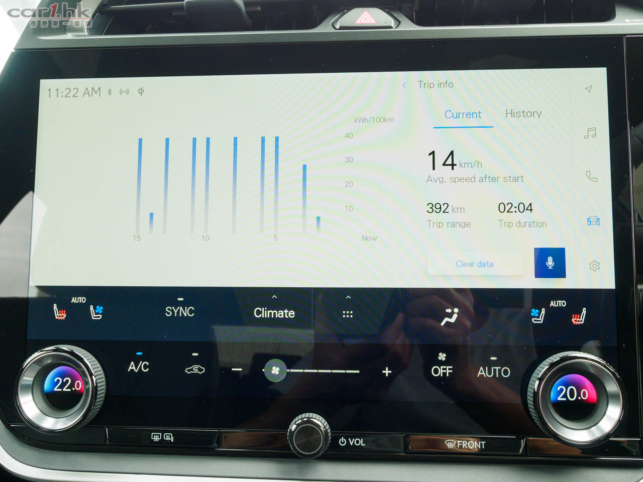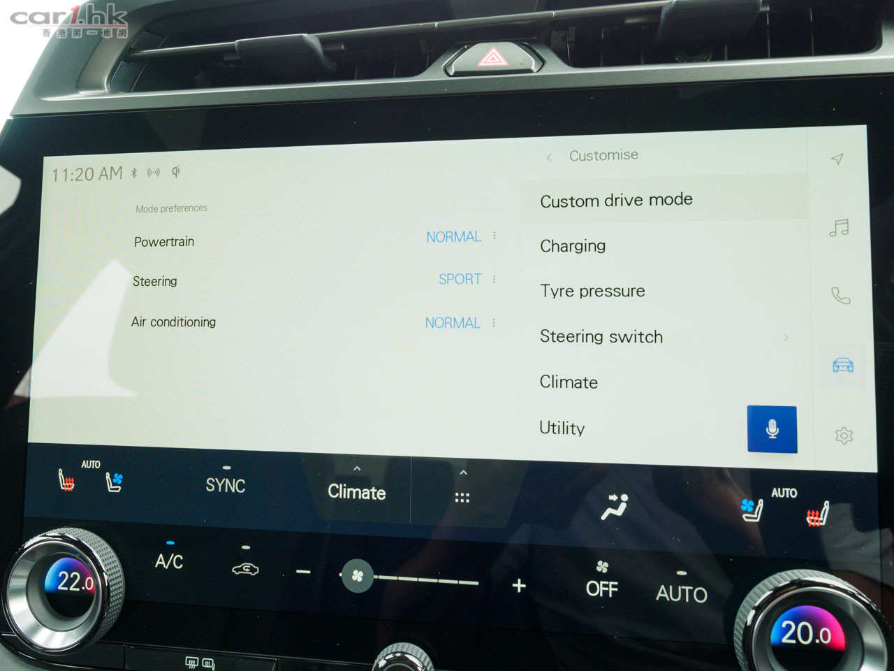 白底黑字蓝按钮的主屏幕与前作相同;Drive Mode 设有 Normal、Sport、Eco,以及关闭冷气的 Range 模式。