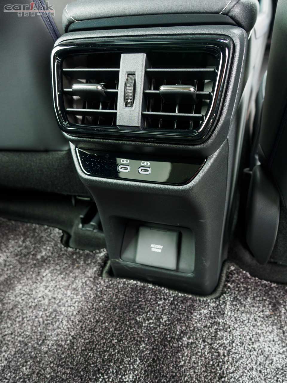 后排中控板设有冷气风口及两个充电插头,但取消了旧款后座配备的暖气开关。