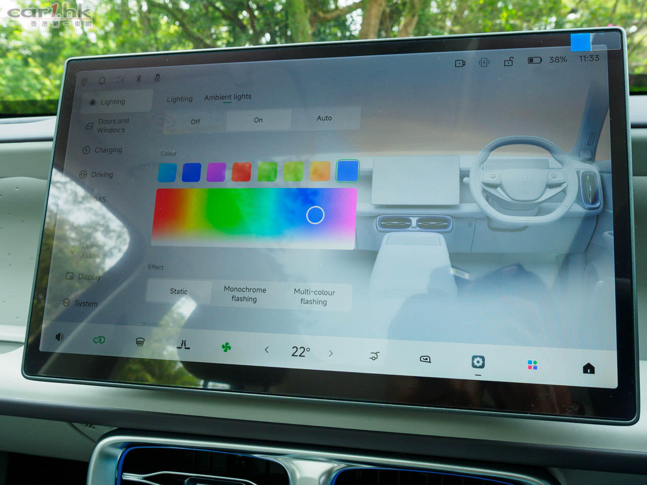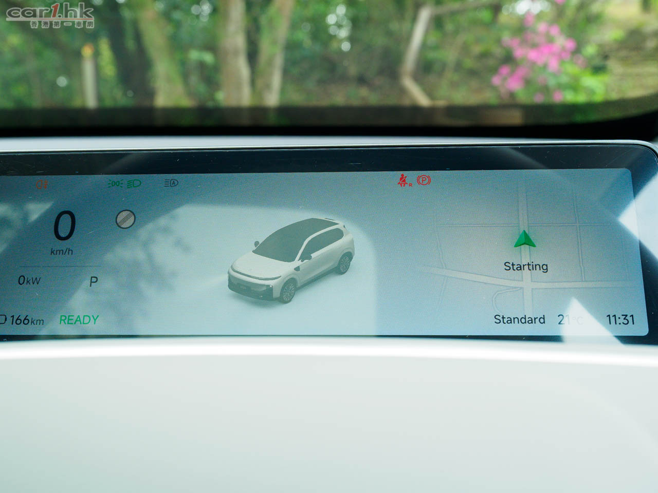 车子 0-100km/h 加速需易扭易去但不算快的 7.5 秒,摄位争线没有难度,后轮驱动不怕大脚加速时像前驱电车般前轮空转。驾驶反应没有预设的 Drive Mode 选择,但在 Driving 一页内可独立拣选三种踩电反应、三种拖慢回充度、三种軚盘重量,全要伸出浮动的手指向屏幕揿,另有 HDC 落斜慢爬、Comfort Stop 停车减“chok”;三个 Steering Assist Image、Start-up Assist、Hill Assist Image 功能,在打灯转线、入 D 波起步、斜路起步时屏幕会转去显示 360 度镜头。有部车仔又有些数字的仪錶与大围做法没大分别,右边可“碌”出 Trip 计/耗电量、地图、蓝牙音乐。