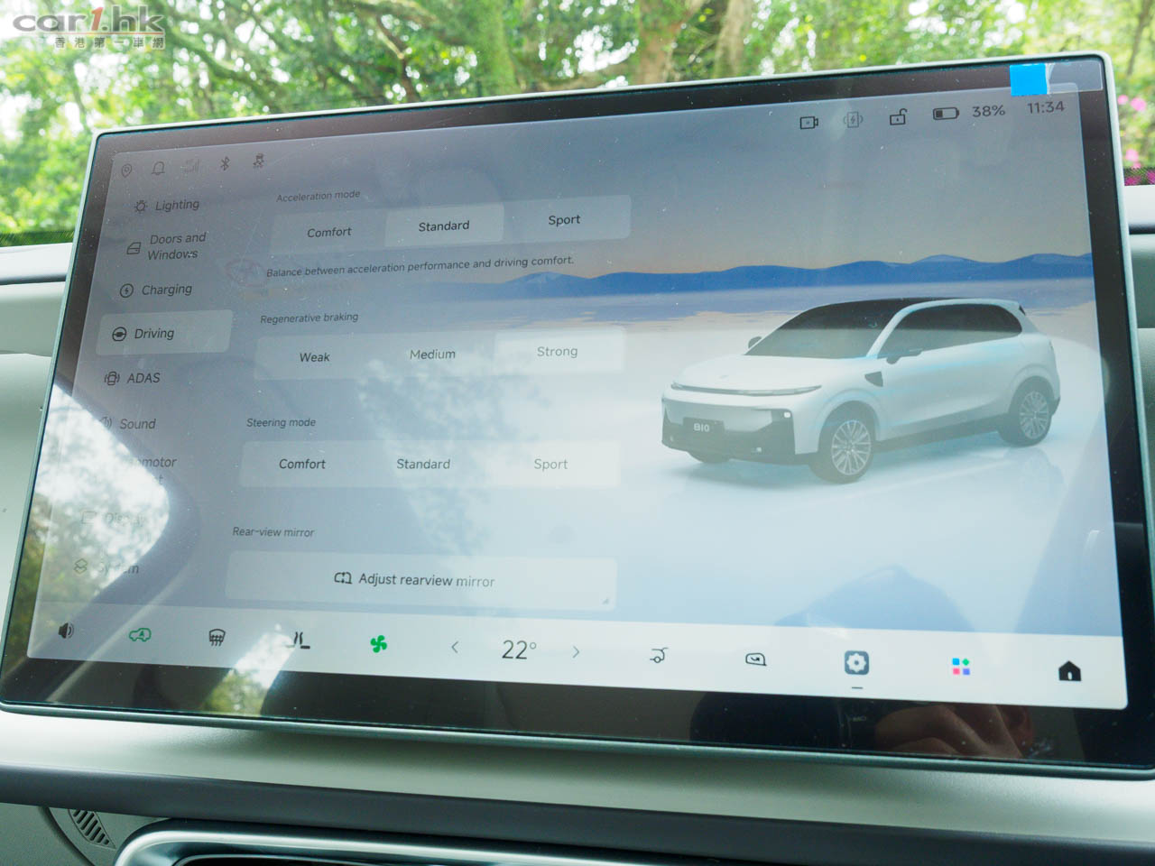 驾驶反应没有预设的 Drive Mode 选择,但可独立拣选三种踩电反应、三种拖慢回充度、三种軚盘重量,全要伸出浮动的手指向屏幕揿。