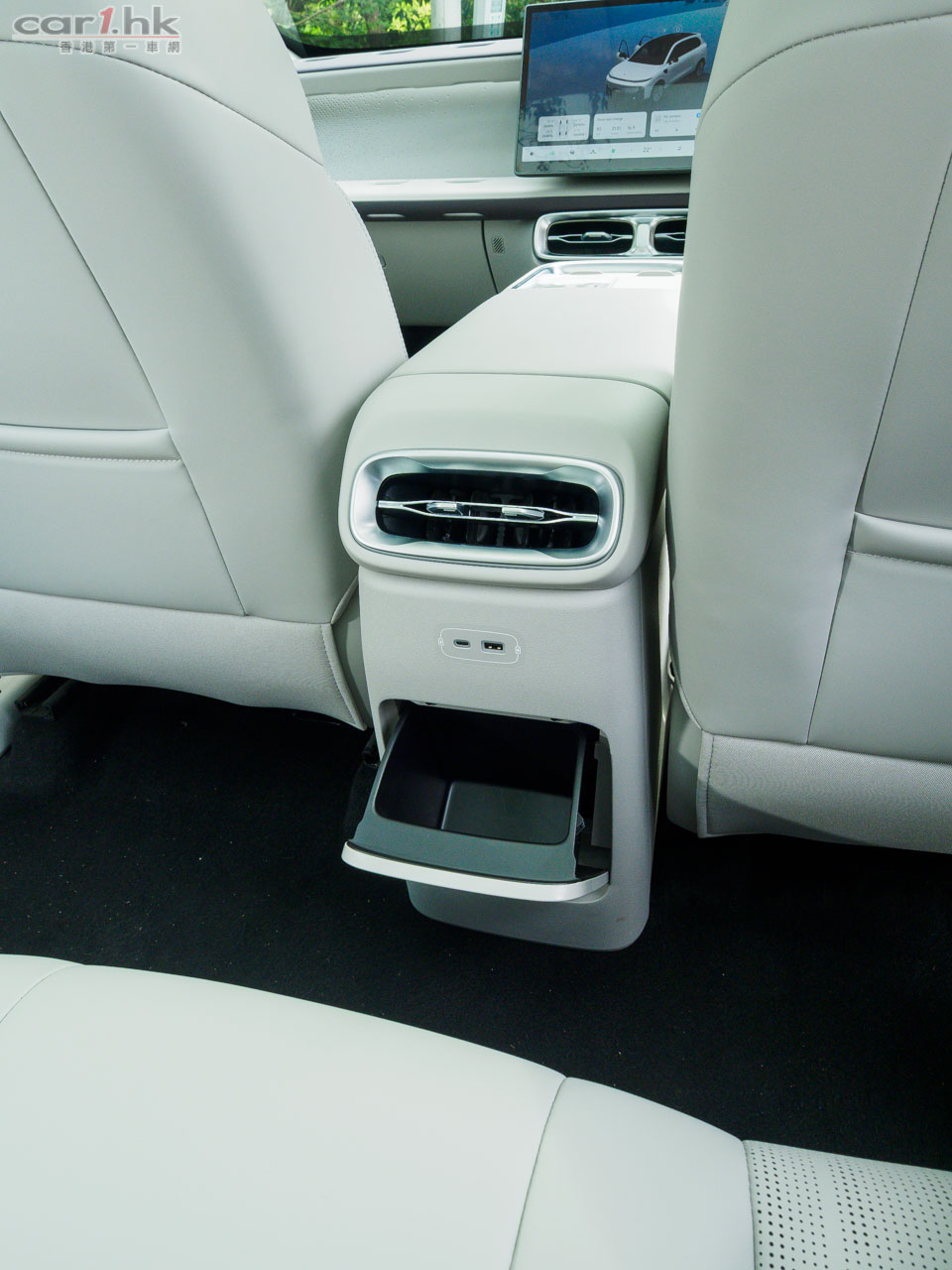 后排中桥有充电插头、小抽屉,冷气风口同是“窗花”式样。