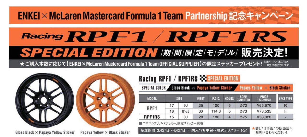 日本轮圈巨头 ENKEI 正式宣布与 McLaren Mastercard Formula 1 Team 深度合作,推出以 F1 车队涂装为灵感来源的限量版铝合金轮圈系列。这次登场的型号包括改装界常青树 Racing RPF1 以及复古运动风格的 RPF1RS。两款限量型号均採用了 McLaren 最具标誌性的“Papaya Yellow”木瓜橙色与黑色进行交织设计,将顶级赛车运动的视觉冲击力从赛道带到一般街道。