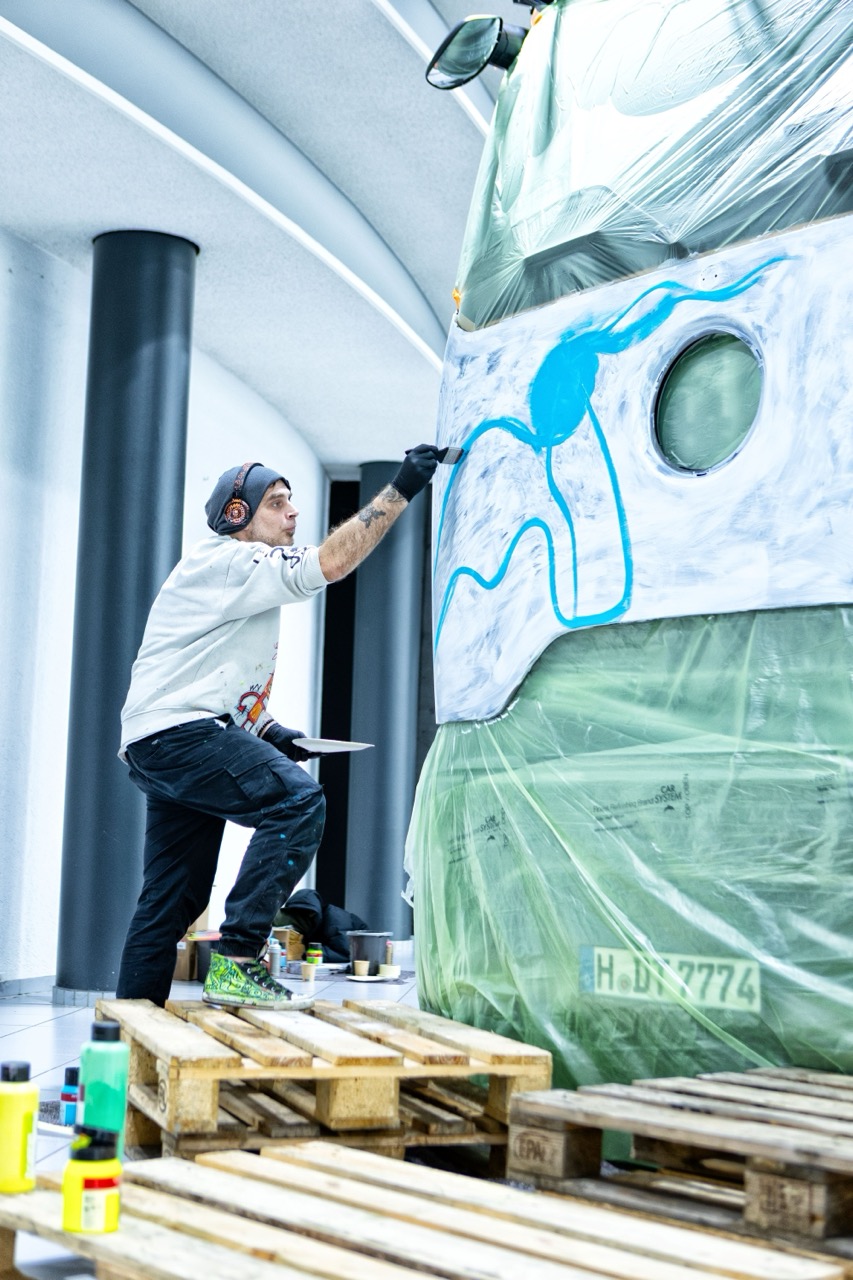 最令人惊叹的是,主理这次创作的艺术家 Sven Liesy 虽然患有红绿色盲,但他却能凭藉独特的感知力,创造出色彩极其浓郁且具备情感深度的作品。他的作品曾于柏林、马德里,甚至在我们香港艺术馆(Hong Kong Museum of Art)展出过。这次他将丙烯颜料从传统画布转移到非传统的卡车车身,证明了商用车也能成为公共空间中的沟通桥樑,吸引从职业司机到大众市民的目光。
