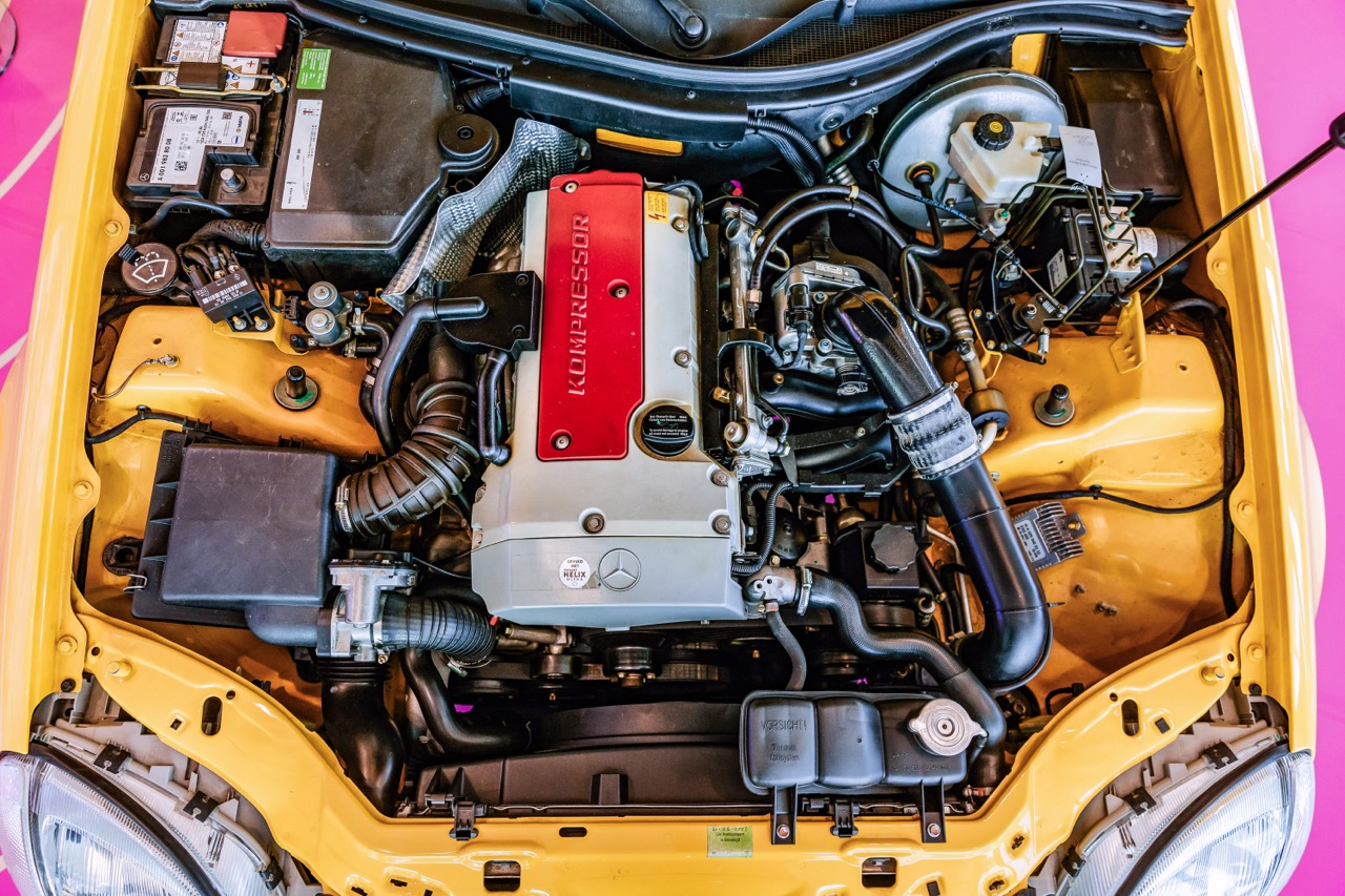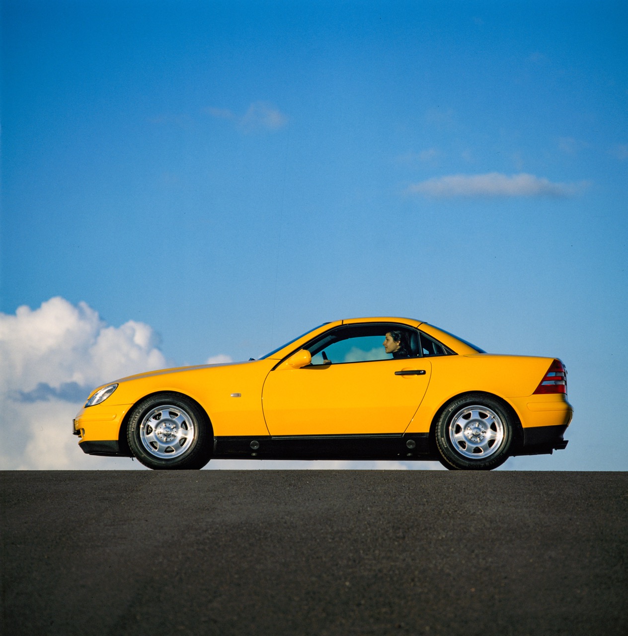 为了展现“Joie de Vivre”(生活乐趣)的精神,R 170 在色彩运用上极其大胆。当年媒体试驾车清一色採用夺目的 Yellowstone 鲜黄色,后期小改款更引入了马格马红、莲花黄等大胆内饰色调,打破了宾士一贯沉稳肃穆的形象。这款车不仅好看,机械素质亦非常扎实。它借鉴了代号 W 202 C-Class 的底盘组件,採用前双横臂、后多连桿悬挂,并将车身降低 20mm。其前窄后宽的轮胎配置(如 SLK 230 Kompressor 前 205/55 R 16、后 225/50 R 16),配合来自 E-Class 的制动系统,令这台车长不足 4 米的小钢炮拥有极佳的操控灵敏度。