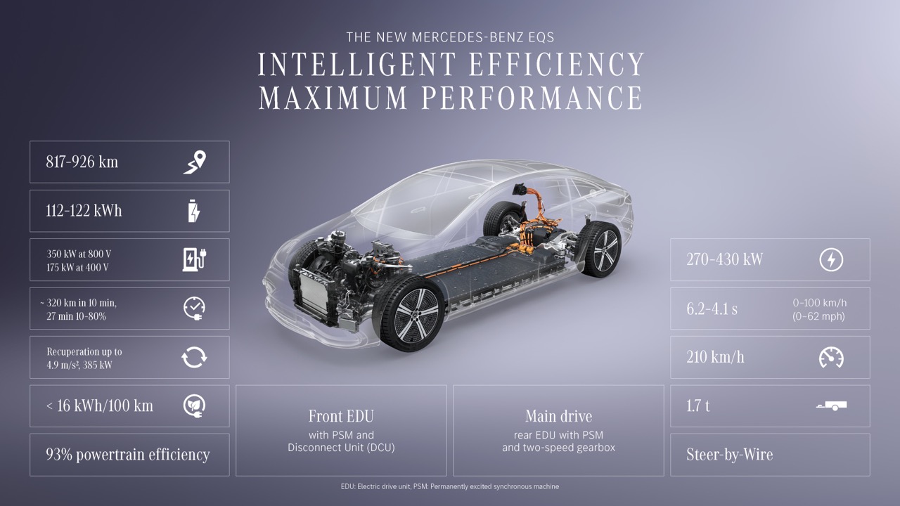 新一代 EQS 最令人震撼的数据,莫过于其高达 926 公里的 WLTP 续航里程(EQS 450+ 錶现)。相比前作,续航力大幅提升了 13%,这意味着用家可以由德国慕尼黑一路开到法国巴黎,中途完全不需要进入充电站。